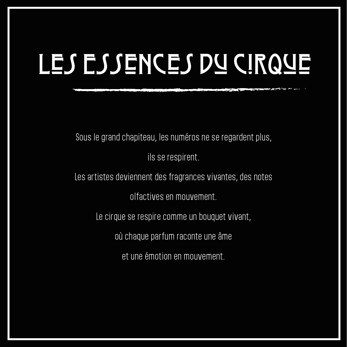 Mon projet présente le cirque à travers l’univers des parfums. Chaque artiste devient une fragrance qui reflète sa personnalité et son rôle.